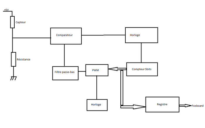 Il reste à mettre le comparateur entre le capteur et la sortie de notre filtre passe-bas. Pour ce qui est de la partie numérique sous Altium, il nous reste à stocker les bits quand la comparaison est à 1 ( +5V au niveau du Nanoboard ) dans un registre pour pouvoir ainsi les envoyer au foxboard via la liaison série.
