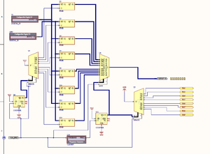 Cette séance a permis de prendre en main la NanoBoard et sa configuration sur Altium. Le développement du programme de gestion de la matrice de LEDs par la NanoBoard a commencé. A la fin de cette séance, le programme enregistre des paramètres d'entrés(valeur des LEDs) puis envoie les mots de chaque colonnes selon la fréquence d'une horloge paramétrable, sur l'affichage LEDs de la NanoBoard. Le mot de 8bits servant de sélection de la colonne à afficher est envoyé sur le port HEADER A en sortie.