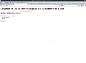 - -index.html : cette page sert de page d'accueil et permet à l'utilisateur de choisir les caractéristiques de la matrice de LEDs. En effet, il est possible de choisir le nombre de ligne n, le nombre de colonnes m, et le type de LEDs : monochrone ou RGB. Le fichier est donc composé d'un formulaire qui envoie vers un autre fichier : matrice_leds.php