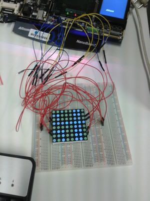 Lorsque le mode 8x8 a fonctionné, nous avons commencé à brancher tout le système avec le module de communication série et la Nanoboard. Nous devions à présent corriger le problème de décalage rencontré à la dernière séance. Au départ, une solution informatique avait été envisagée. Mais il s'est avéré que recâbler les entrées des bascules D était plus rapide et fonctionnait également. Après avoir fait ceci, nous avons modifié la fréquence d'horloge de la Nanoboard pour que la persistance rétinienne nous permette de voir un signal fixe et pour que la luminosité des leds soit suffisante pour être bien visible.