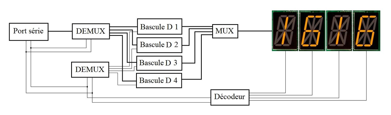 On récupère les informations du port série, ainsi que son signal d’horloge. On mémorise ces informations grâce aux bascules, elles même gérées par un démultiplexeur relié à l’horloge du port série. On cadence ainsi les informations afin que le multiplexeur les reçoivent une par une. Le décodeur va ensuite choisir tour à tour un afficheur grâce au signal d’horloge, et le multiplexeur envoie ainsi une information sur tous les afficheurs, mais seulement un sera allumé à ce moment grâce au décodeur.