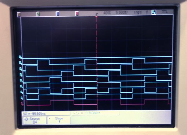 On voit ici de D7 à D4 les 4 bascules, et de D0 à D3 les 4 codes binaires envoyés.