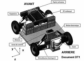 Le Robucar est un véhicule automatique "intelligent", autonome et électrique, commercialisé par la société ROBOSOFT. Il est composé d'un châssis à quatre roues motrices et directionnelles pilotables séparément. Il y a donc deux paramètres de commande pour chaque roue : l'orientation et la vitesse de rotation). Le véhicule est équipé d'un ordinateur de bord et d'une carte d'acquisition Temps Réel DSPACE qui récupère les données du véhicule. L'accès à ces données sur d'ordinateur intégré est rendu possible par la librairie CLIB. Celle-ci permet, en effet, de récupérer les données acquise par la DSPACE.