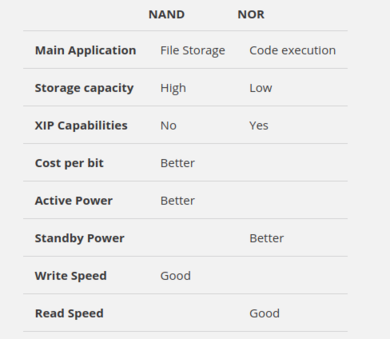 Les mémoires Flash sont divisées entre les Flash NAND et les Flash NOR, dont le comparatif ci-contre est donné par Microchip. Elles diffèrent l'une de l'autre par les connexions des cellules mémoires individuelles. XIP représente la capacité à exécuter du code contenu dans la mémoire Flash sans avoir à le copier dans la RAM auparavant. Cela libère ainsi de la RAM pour d'autres utilisations.