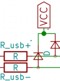 On nous conseille de prévoir de quoi protéger notre port USB contre les décharges électrostatiques - il ne s'agit pas ici d'adaptation de la tension pour le contrôleur. Ces décharges peuvent apparaître lorsque deux appareils entrent en contact car il est très probable qu'ils possèdent un potentiel de masse différent. Ces décharges peuvent endommager les appareils. C'est d'autant plus risqué lorsque le branchement a lieu à chaud. La protection consiste en un suppresseur de décharge ("ESD suppressor") constitué de diodes spécifiques et éventuellement une résistance de 22ohms sur chaque ligne de données.
