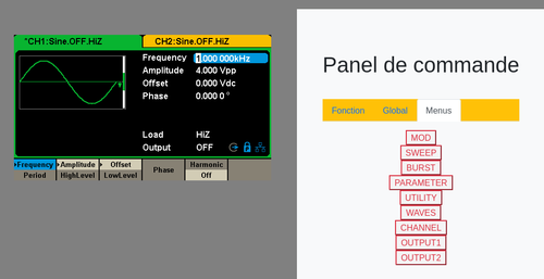 Cette fois-ci je m'attaque pour de bon à la réalisation de l'interface du générateur de signaux SDG1032X. Pour commencer, j'assigne une adresse IP valide à l'appareil, puis je m'assure tout d'abord qu'il est possible de réaliser une capture d'écran avec la commande 'lxi screenshot'. Cette commande fonctionne, donc on pourra l'utiliser pour l'affichage sur l'interface Web. En parcourant les commandes LXI disponibles dans la documentation, je m'aperçois qu'il existe une commande permettant de simuler l'appuie d'une touche sur le générateur. Cette commande permet de faciliter grandement la tâche par rapport à l'oscilloscope. L'interface ne sera donc composée que de boutons comme pour le générateur physique. Avec la commande SCPI 'VKEY VALUE,<valeur>,STATE,1', on peut réaliser la pression de la touche 'valeur'. Les valeurs des touches sont indiquées sur la documentation.