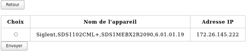 Pour réaliser l'interface web, j'utilise un serveur Apache2 et le langage PHP (sous Linux utilisation des commandes : "apt-get install apache2" et "apt-get install libapache2-mod-php"). Pour le moment, on peut lancer la recherche des appareils connectés au réseau (réalisé avec la commande 'lxi discover'); puis choisir l'appareil que l'on souhaite utiliser.