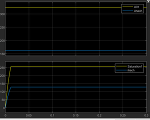 En ce qui concerne les correcteurs de courant, notre objectif était de passer par le calcul, de la même façon qu’en 5.a) . Cependant, nous ne sommes pas parvenus à simplifier les équations. Nous avons donc décidé de procéder par taton. Le but étant d’avoir le temps de réponse le plus bas et un dépassement de 5% au maximum. Les correcteurs optimaux que nous avons trouvés sont : Kp = 5.45 et Ki = 6000. Voici la réponse à un échelon. En bleu la consigne, Im1ref et en jaune sa réponse.