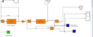 Concernant la partie mécanique, nous n’avons pas ajouté de bloc supplémentaire. Nous avons modifié les valeurs dans le bloc de la fonction de transfert mécanique de la mcc2. En effet, nous avons ajouté la valeur du couple résistant moteur de la mcc1 J.domega(t)/dt=Cm1(t)-Cm2(t)-Cs(t)-f(t) et nous avons changé la valeur de J qui correspond à présent à la valeur du rotor 1, rotor 2 et à l’axe de rotation.