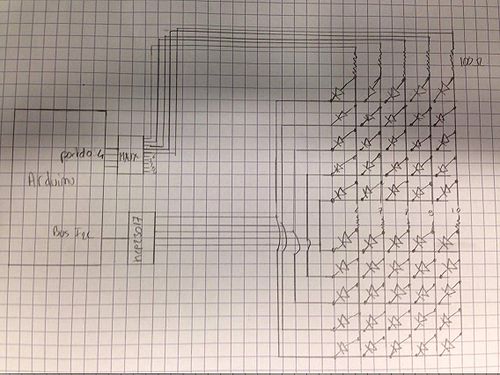 Après avoir réfléchi au problème d'intensité des LED, la solution que nous avons retenue est d'allumer une LED à la fois. Nous avons aussi pris la liberté de changer l'expandeur par un Shift Register qui est plus simple d'utilisation pour la même rendu (dans notre cas).