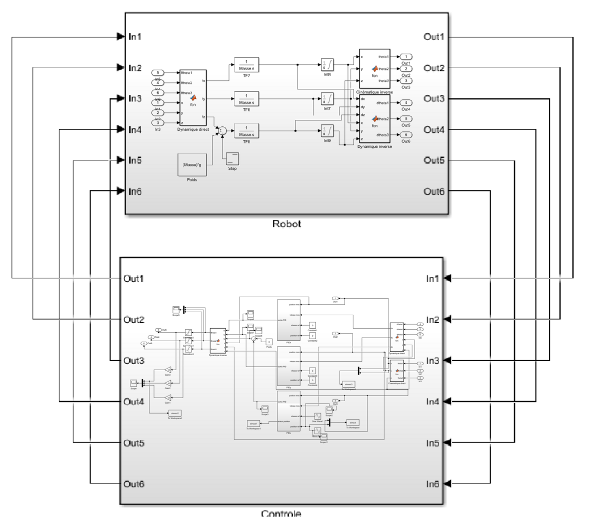 • Avec nos recherches sur internet et dans le cours de Robotique 1, nous avons essayé de comprendre le travail réalisé. Nos difficultés ont été principalement l'étude de la dynamique et cinématique (directes et inverses). Les données entrées/sorties de chaque bloc ne correspondait pas à ce que nous aurions du effectivement avoir.