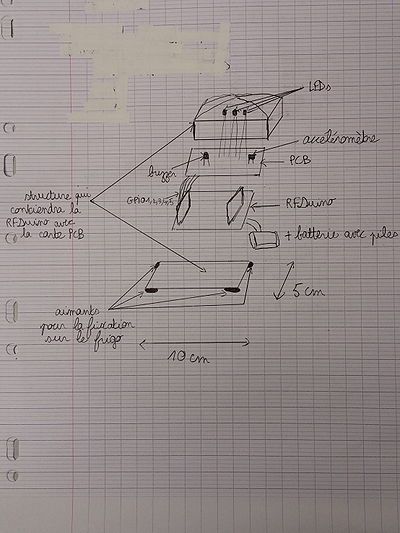 • Un boîtier permettant d'intégrer la RFduino + fixation sur le frigo (modélisation à voir).