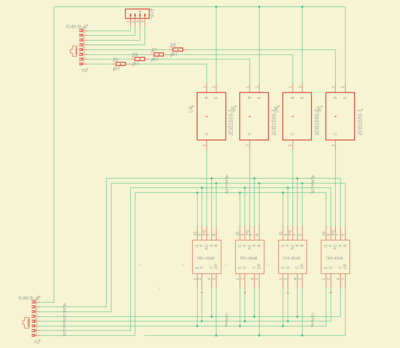 Afin d'envoyer les données sur le serveur, il faudra connecter la carte électronique sur les prises RJ45 se trouvant sur chacune des paillasses. Pour cela, la réalisation d'un circuit reprenant les shields Ethernet pour Arduino sera nécessaire. En se basant sur le schematic du shield Ethernet fourni par le site www.arduino.cc, les composants nécessaires sont les suivants :