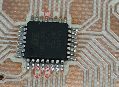 Cette étape s'est à priori bien déroulé et les composants de surfaces sont désormais fixés sur le PCB. Toutefois, à ce moment nous nous sommes rendu comte d'un problème sur le PCB : le plan de masse n'est pas relié aux ports 3,5 et 21 (les 3 GND) de l'ATmega328p-AU. Ceci est probablement une conséquence d'une erreur de manipulation malheureuse, lors de la modification de dernière minute des règles Altium concernant la "clearance" entre les pistes. Ce problème n'est néanmoins pas insurmontable, et nous décidons de régler cela à la main à l'aide de câble le plus fin possible, de crème à braser et d'un fer à souder.