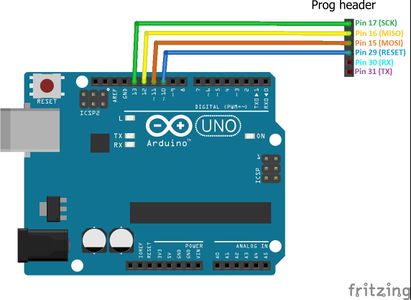 En résumé, il suffit d'utiliser une carte Arduino à 2 reprises suivant un schéma différent pour encoder l'ATmega328p-AU (voir ci dessous). La première consiste à utiliser l'arduino pour burn le bootloader, et la seconde consiste à retirer l'ATmega328p-PU de la carte arduino et, avec le branchement adéquat, encoder l'ATmega328p-AU de notre PCB en faisant comme si il s'agissait de l'ATmega328p-PU de l'arduino.