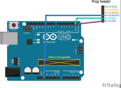 • Comment encoder un ATmega328p-AU : nous avons dans un premier temps pensé qu'un module FTDI (convertisseur USB vers port serie TTL) serait nécessaire pour réaliser cela, mais il suffit en réalité de simplement utiliser une carte Arduino sans son micro-contrôleur.