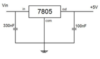 Nous nous sommes rendu compte que nous avions oublié un élément essentiel dans la conception du réveil : un stabilisateur 5 Volt. En effet, jusqu'à présent en utilisant l'alimentation de l'Arduino nous n'avons pas rencontré ce problème mais lorsque le réveil utilisera un boitier à pile dont la tension doit être supérieure à 5Volt (puisque la tension chute rapidement aux bornes des piles), il faudra ensuite la stabiliser aux 5V requis pour le bon fonctionnement de l'ATmega328p et de tous les autres composants. Nous avons donc convenu que la solution la plus simple dans le cadre de notre projet était d'utiliser un L7805.