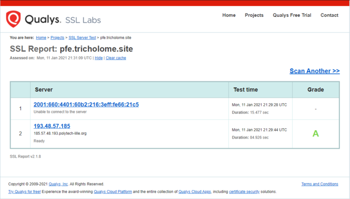 Grâce au site : https://www.ssllabs.com/ssltest/ nous pouvons vérifier la sécurité de notre serveur web