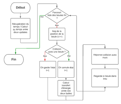 On a codé la méthode BallTable.update(), qui à pour effet de mettre à jour les positions des balles ainsi que leurs vitesses. Cette méthode applique cet algorithme :