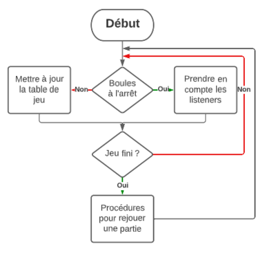 - La classe Main qui initialisera les classes de vues, les listeners ainsi que la table de jeu, et qui gèrera itérativement le jeu entier