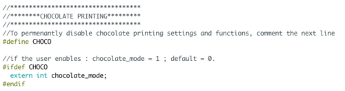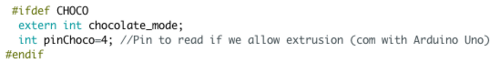 Dans le fichier configuration.h, nous définissons une variable externe, globale à tous les fichiers, qui indique si l'utilisateur veut imprimer du chocolat ou de manière classique.