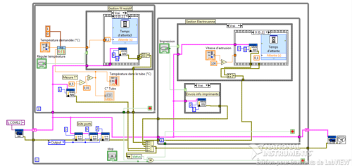 Le projet fonctionnera sur Labview, qui permet d'obtenir une interface facile d'utilisation pour n'importe quel utilisateur. De plus, ce logiciel s'adapte très bien à l'arduino, et il est conçu pour la régulation et la mesure. La principale contrainte de notre projet étant la gestion de la température en sortie de l'extrudeur, et la mesure de la pression, Labview nous semble la meilleure solution.