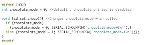 Dans le fichier ultralcd.cpp, nous ajoutons l'option d'activer ou de désactiver l'impression du chocolat, ainsi qu'une fonction pour modifier l'état de la variable définit précédemment.