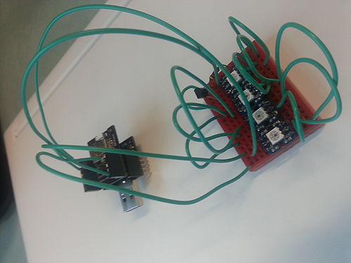 Nous avons eu une réponse de notre encadrant a la fin de cette semaine. De ce fait, nous avons continuer d'améliorer notre premier prototype. Nous avons notamment modifier le code RFduino pour permettre de changer la couleur d'un Néopixel à la fois (en respectant la syntaxe 1:FF0000 pour allumer le premier Néopixel en rouge).