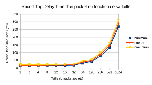 Afin d'obtenir un meilleur résultat, le rtt a été calculer à partir de la moyenne de l'envoie de 100 paquets à la fois. On calcule aussi le temps minimum et maximum sur le 100 paquets: