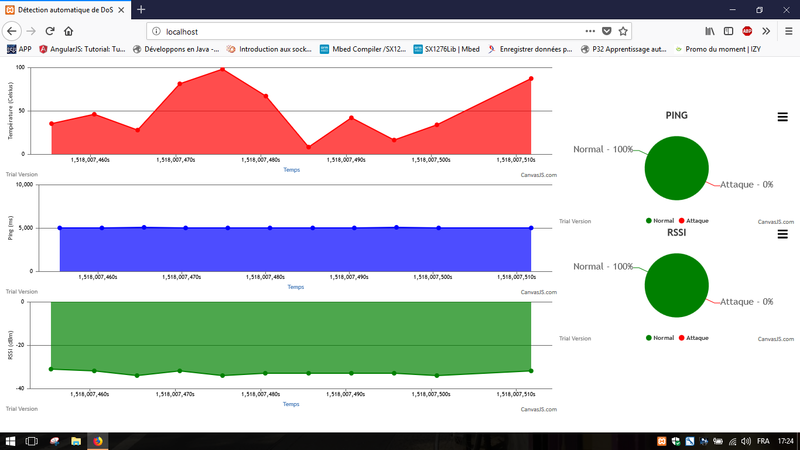 Pour réaliser ces tests, j'ai laissé tourner mon algorithme durant une demi-heure avec un trafic normal et suis venu ajouter un émetteur pirate entre l'émetteur et le récepteur. Nous observons les graphes suivants :