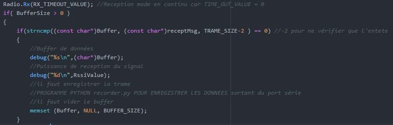 Il y a donc un fichier emetteur.cpp et recepteur.cpp pour la réception et l'émission. Chaque fichier est compilé avec la librairie SX1276 via le Mbed Compiler. Un fichier binaire permet ensuite de flasher le microcontrôleur.