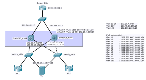 A l'origine, le matériel sur lequel nous travaillons nous est mis à disposition dans une configuration un peu particulière. En effet la carte superviseur (carte mère) du routeur est livrée avec un système d'exploitation CatOS, tandis que la carte routage (carte fille) fonctionne sous IOS. Dans un premier temps la tâche consistera donc de migrer complètement le routeur vers un système IOS. On pourra par la suite configurer les différents VLANs et la connexion redondante sur les routeurs (groupes 1 & 2). Pour plus de clarté sur l'architecture du réseau, je vous invite à consulter le schéma mis en place par nos collègues du groupe 1.