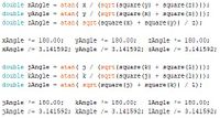 Comme dit précédemment, nous recevons des valeurs d'accélération en g comprise entre 0 et 280. Nous avons donc créé une variable de type double pour chaque axe et utilisons la fonction atan() nous permettant de convertir ces mesures en angle. On multiplie cette valeur par 180 ou 3.14 selon l'unité de l'angle voulue (degrés ou radians).