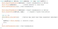Nous créons 6 variables correspondant aux axes x, y et z (j, k, l respectivement pour le 2e capteur) dans lesquelles nous stockeront les données contenues dans le buffer. Etant stockées sur 2 octets, nous stockeront buffer[0] et buffer[1] dans les variables x (et j), buffer[2] et buffer[3] dans y (et k), buffer[4] et buffer[5] dans z (et l).