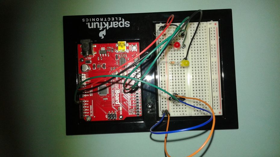 • Dans un deuxième temps, le câblage a été réalisé sur l'arduino RedBoard. Cette fois-ci, les résistances ont été incluses ainsi que le capteur de température. Le capteur de température est connecté au pin analogique 0 : le pin central va sur A0. Les autres pins sont reliés à 5V et à la masse. La première LED1 est connectée au pin 9 et à la masse, la LED2 au pin 10 et à la masse et la LED3 au pin 11 et à la masse. Voici une photographie du montage :