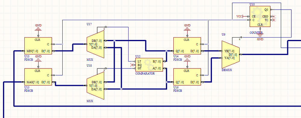 Nous effectuons ensuite une comparaison entre les valeurs des deux mémoires et les renvoyons dans deux autres mémoires correspondant aux températures minimum et maximum. Nous utilisons pour cela deux démultiplexeurs et un comparateur. Cela permettra d'empêcher des problèmes éventuels suite à la réception du maximum avant le minimum, par exemple. Il nous reste à gérer le cas où les deux températures reçues sont égales.