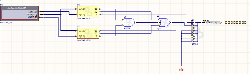 • Dans un premier temps, nous avons créé un circuit sous altium avec des valeurs simulées pour la température ainsi que pour les valeurs de seuil. Nous avons pour cet essai allumé des LEDs déjà présentes sur la nanoboard. La LED0 faisant office de LED jaune, la LED1 de LED verte et la LED2 de LED Rouge. Le schéma logique suivant a ainsi été construit :