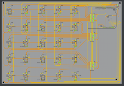 Cette séance a été dédiée à la conception du circuit électronique du plateau de jeu afin de rendre les branchements plus faciles. Pour cela nous avons utilisé le logiciel frizing qui permet d'un côté de réaliser un schéma du montage, et d'un autre de dessiner la carte. La tâche s'est avérée plus complexe que nous ne le pensions au vu de la disposition et du nombre de composants en jeu. Il a fallu recommencer plusieurs fois et continuer le travail à la maison pour en arriver au résultat final et envoyer la carte électronique en fabrication.