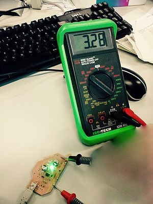 Nous avons réalisé une carte pour contrôler l'allumage d'une LED en utilisant quelques matériels notamment des piles,une résistance,des aimants,..Le but était de vérifier si les aimants(à cause des métaux qui les composent) pouvaient être soudés sur la plaque et si ces derniers étaient conducteurs. Même si nous avons eu du mal à fixer les aimants sur la plaque dû au fait qu'ils sont miniatures, le test a été concluant : les aimants néodymes sont conducteurs. Voici une photo de la carte.