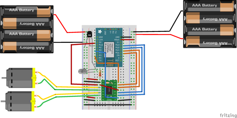 Nous nous sommes rendus compte que les piles ne délivraient pas assez de puissance pour alimenter l'ESP8266 et le driver moteur Pololu de manière optimale. Nous avons donc décidé d'utiliser deux boîtiers de piles : chacun alimentant l'un des composants.