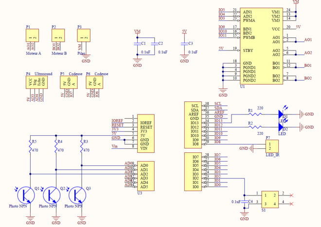 Nous avons convenu de réaliser des cartes électroniques pour les robots suiveurs, de façon à avoir un montage plus propre et plus stable. Les composants du robot de tête seront, quant à eux, montés sur une breadboard et reliés par des fils.
