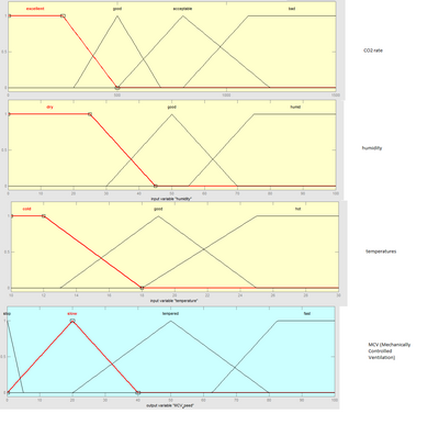 | + | :Nous avons tout d'abord fini d'établir notre modèle flou concernant la qualité de l'air et son lien avec la vitesse de la VMC. La dernière fois, nous avions fini la première étape qui concernait à fuzzifier les entrées du systèmes (paramètres de qualité de l'air). Nous avons donc continué avec l'inférence et la défuzzification que nous allons exposer dans les paragraphes suivants. | ||