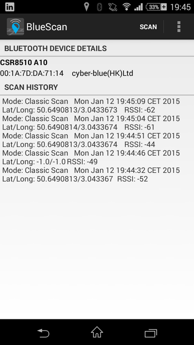 J'ai par la suite testé le tutoriel à l'aide d'une application androïd "BlueScan" permettant de détecter les appareils connectés en Bluetooth.