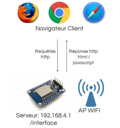 L'utilisateur se connecte sur le robot en AccessPoint WIFI et se rend à l'adresse "192.168.4.1/interface" dans sa barre de navigateur. Ce dernier envoie des requêtes http au robot, qui exécute les ordres, et renvoie la page d'interface de commande. Depuis cette page, l'utilisateur peut contrôler le robot via une interface rudimentaire.