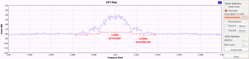 Si on analyse le spectre environnant grâce au module FFT de GNU Radio, lorsque les Xbee communiquent entre eux, on peut apercevoir un pic caractéristique propre. En effet, lors de l'emission d'un message sur le port série, on a un pic qui se dégage du spectre d'amplitude -20dBm. Ce pic est caractéristique au canal de communication choisi et configuré sur le Xbee. Néanmoins, le signal est perturbé par le bruit environnant. L'expérience étant effectuée au sein de l'école, les signaux Wi-Fi perturberont l'étude. Il faut noter que la norme IEEE 802.11 impose au Wi-Fi l'utilisation d'une bande passante s'étalant de 2.4 GHz à 2.5 GHz.