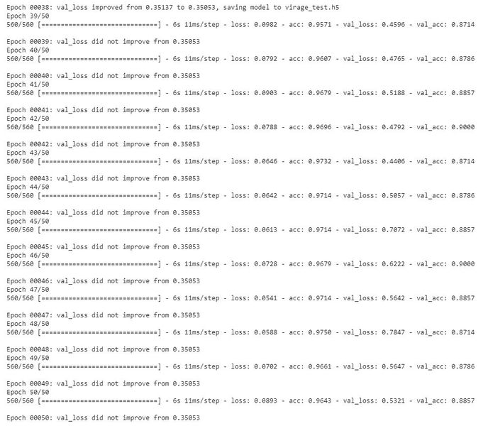 - Suite aux résultats peu satisfaisants obtenus lors de la précédente séance, nous avons effectué un nouvel entraînement sur notre réseau de neurones en nous inspirant d'un modèle existant. Le but de la manoeuvre était de voir le temps mis par le PC pour entraîner notre réseau de neurones en vue d'une possible optimisation de ce modèle. Pour cela, nous avons effectué une série de 10 entraînements à la suite et, globalement, nous avons observé un temps de calcul d'à peu près 5 min pour chaque entraînement ce qui est assez long.