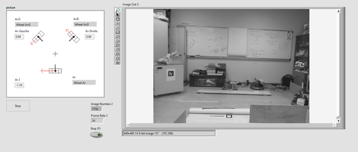 Le module 'vision' de LabView permet la lecture de code bar via plusieurs réglages. Pour que cela puisse fonctionner sur le MyRio sans problème de mémoire et rapidement. La camera a été mise en noir et blanc avec une qualité réduite et un FPS bas à 7,5 Frame/second. Un même code bar est lu plusieurs fois et si et seulement s'il est lu trois fois de suite avec le même code alors il est considéré comme correcte et passe à sa tâche suivante.