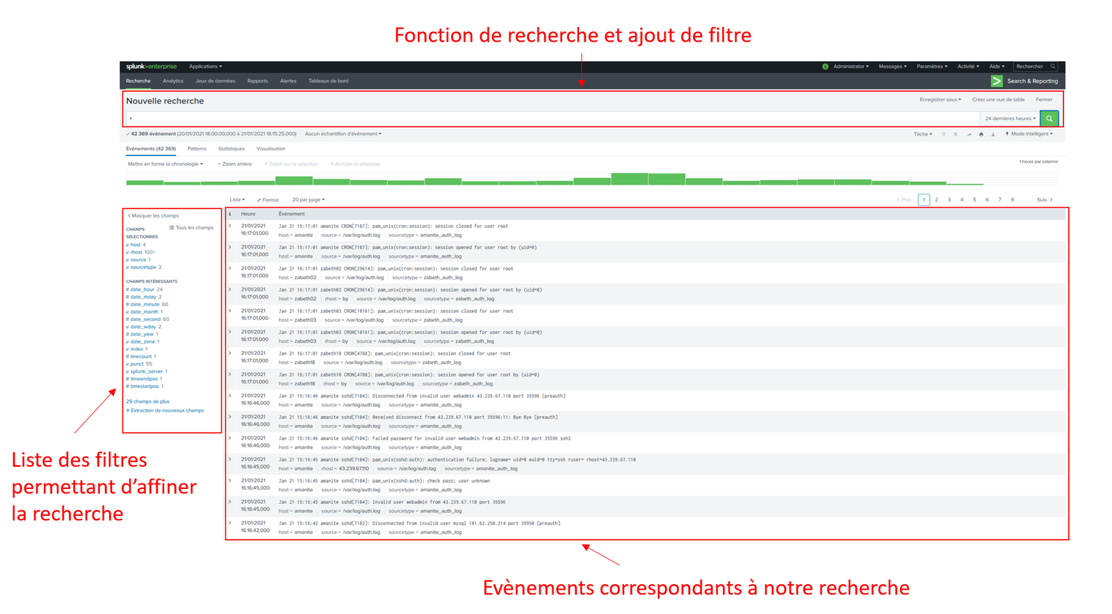 | + | La liste des filtres nous permettant d'affiner notre recherche ce forme toute seule mais nous pouvons également créer nos propres filtres grâce avec des expressions régulières et leur donner un nom afin de les appeler dans notre recherche. Comme nous pouvons le voir sur la photo beaucoup d'évènements sont renvoyés lors d'une connexion ssh, les filtres nous permettent donc de réduire notre champs de vision est de nous concentrer par exemple que sur les tentatives infructueuse. | ||