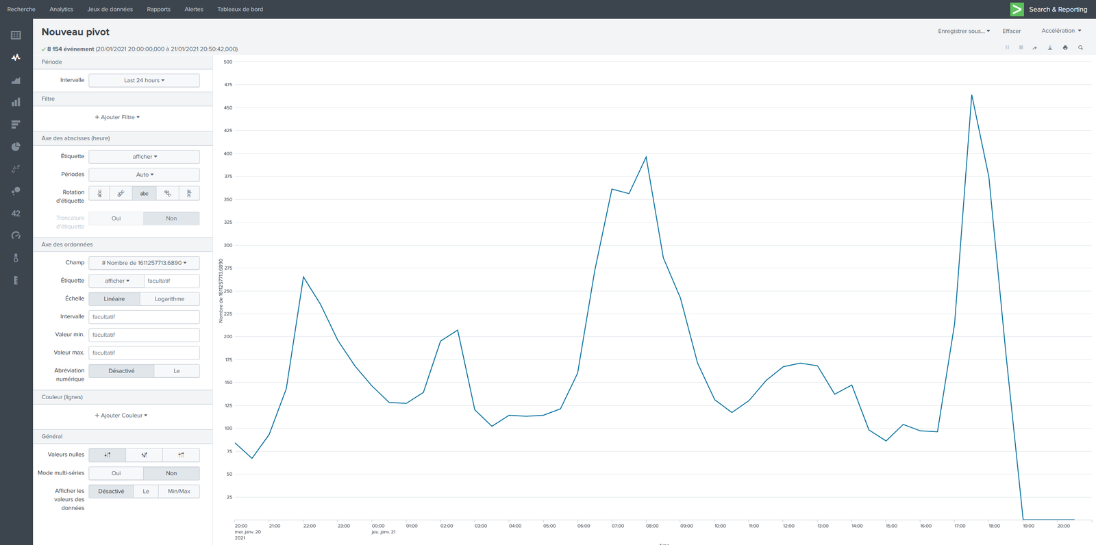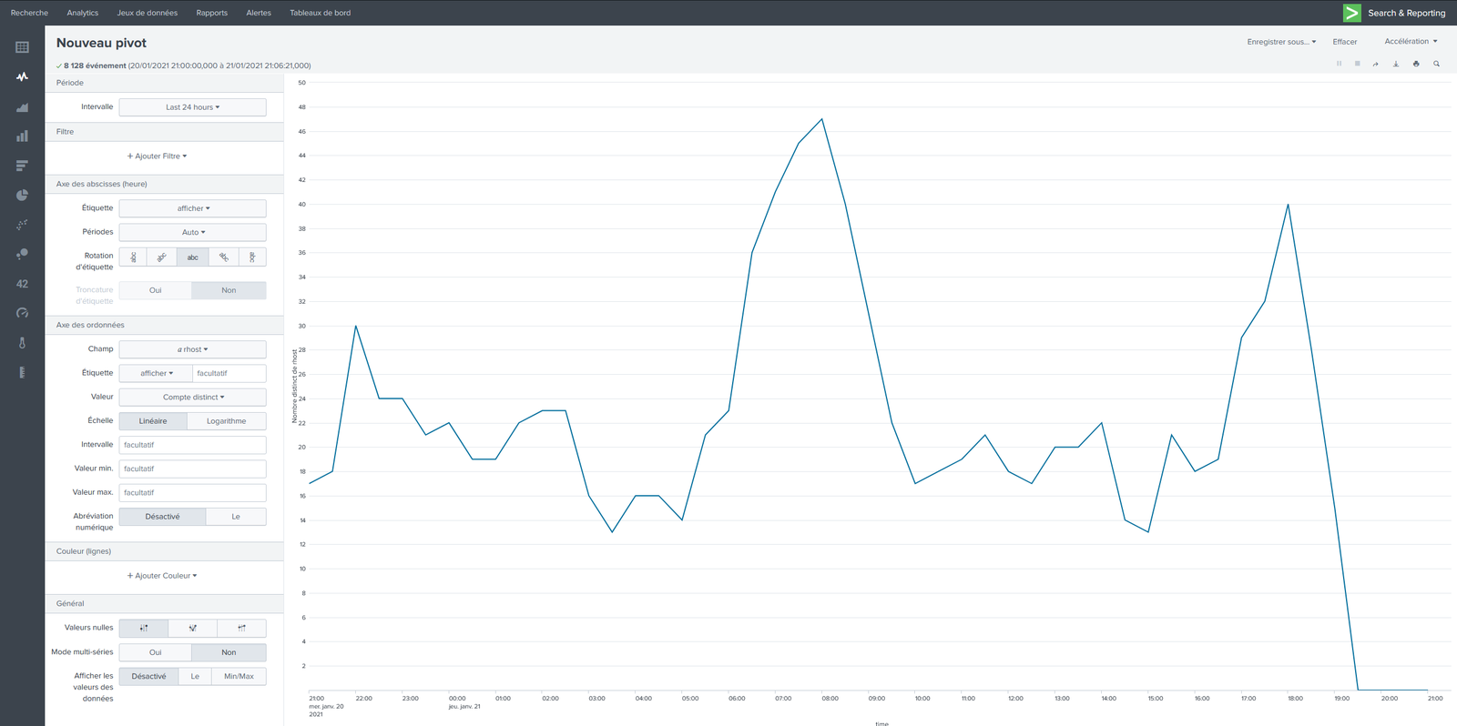 | + | Nous pouvons voir que beaucoup d'évènements sont disponibles mais la mise en page n'est pas très visuel, nous allons donc tracer un graphique, pour ce faire nous appuyons sur "Statistiques" puis "Pivot". Cette fonction nous permet de tracer des multitudes de graphiques en fonction de nos besoins en isolant par exemple les machines depuis lesquels sont faites les connexions ou combien de requêtes sont émises. | ||