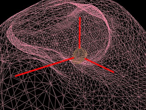 Nous avons grâce à ceci pu coder une méthode adaptée pour tester les triangles de la surface du foie et voir s'ils sont en intersection avec le rayon partant du barycentre de la tumeur et ayant pour vecteur directeur X, Y, ou Z. Une fois le bon triangle trouvé, la fonction se charge de renvoyer le point d'intersection, et il ne reste qu'a récupérer sa coordonnée en X,Y,ou Z (suivant le vecteur directeur précisé dans l'appel à la fonction) qui se trouve être la distance entre la tumeur et la surface du foie. Pour affiner un peu notre méthode, il faut d'abord l'appliquer à l'enveloppe de la tumeur elle même, puis faire de même avec la surface du foie, et soustraire les coordonnées obtenues pour les points d'intersections dans chacune des 3 direction afin d'obtenir une distance correcte pour chaque direction.